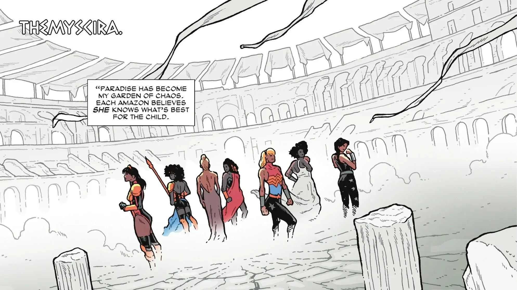 Eris monologues through the narration. She informs us, the readers, that Paradise Island has become her garden of chaos. Each of the Amazons standing assembled before her believes they know what is best for young Lizzie, the infant daughter of Wonder Woman. It becomes clear that she is feeding off the fear that the Amazons hold within their hearts, specifically the doubts that they are not good enough.