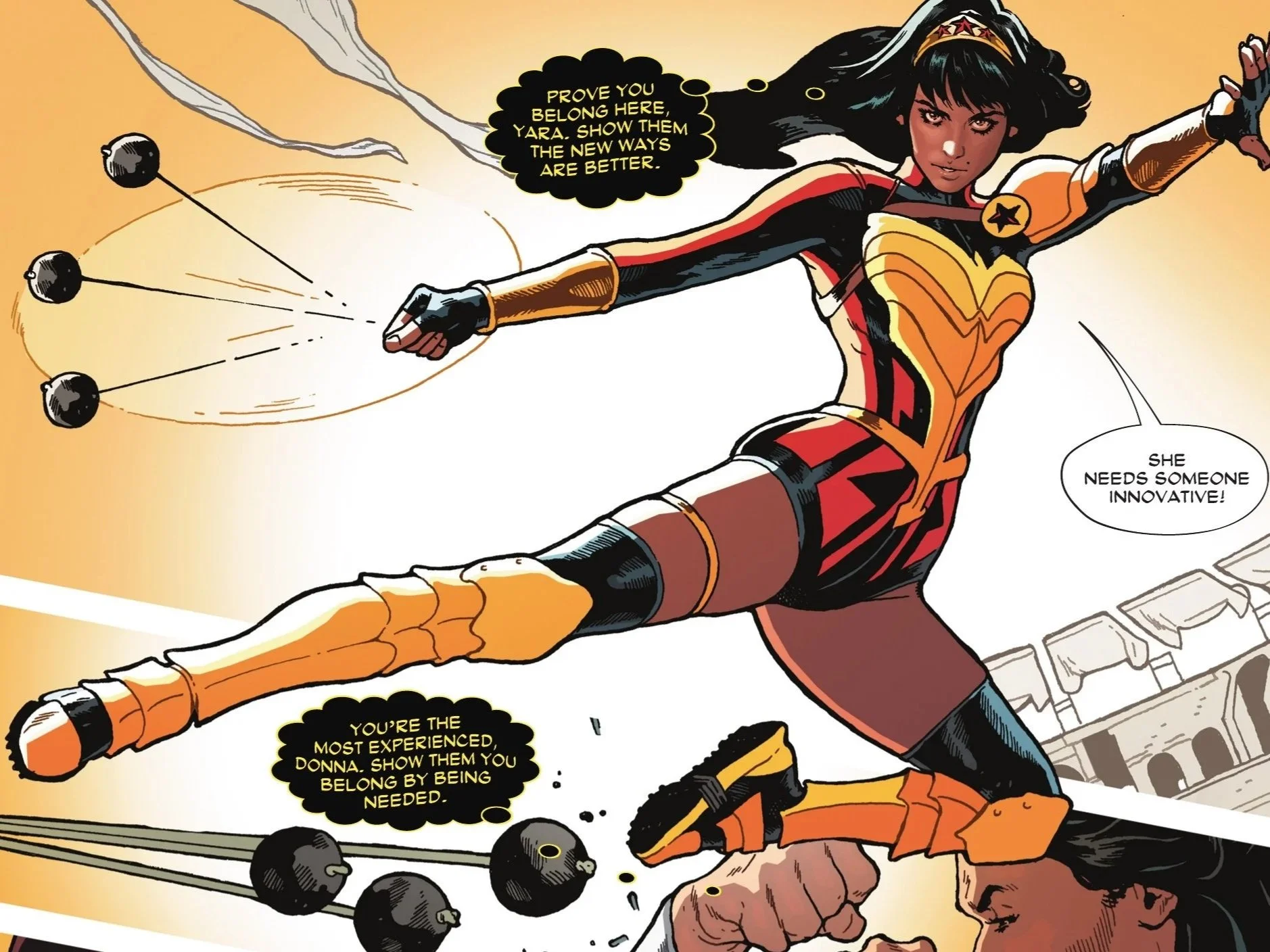 Bia is the only one seemingly unaffected as the Amazons all begin fighting amongst themselves. As she holds Lizzie close, she shouts for the others to snap out of it. She realizes that their internal doubts and fears are only being harvested by Eris, who is feeding off of their energy. That same energy coalesces above them in their frenzied melee, and it manifests as a golden apple.