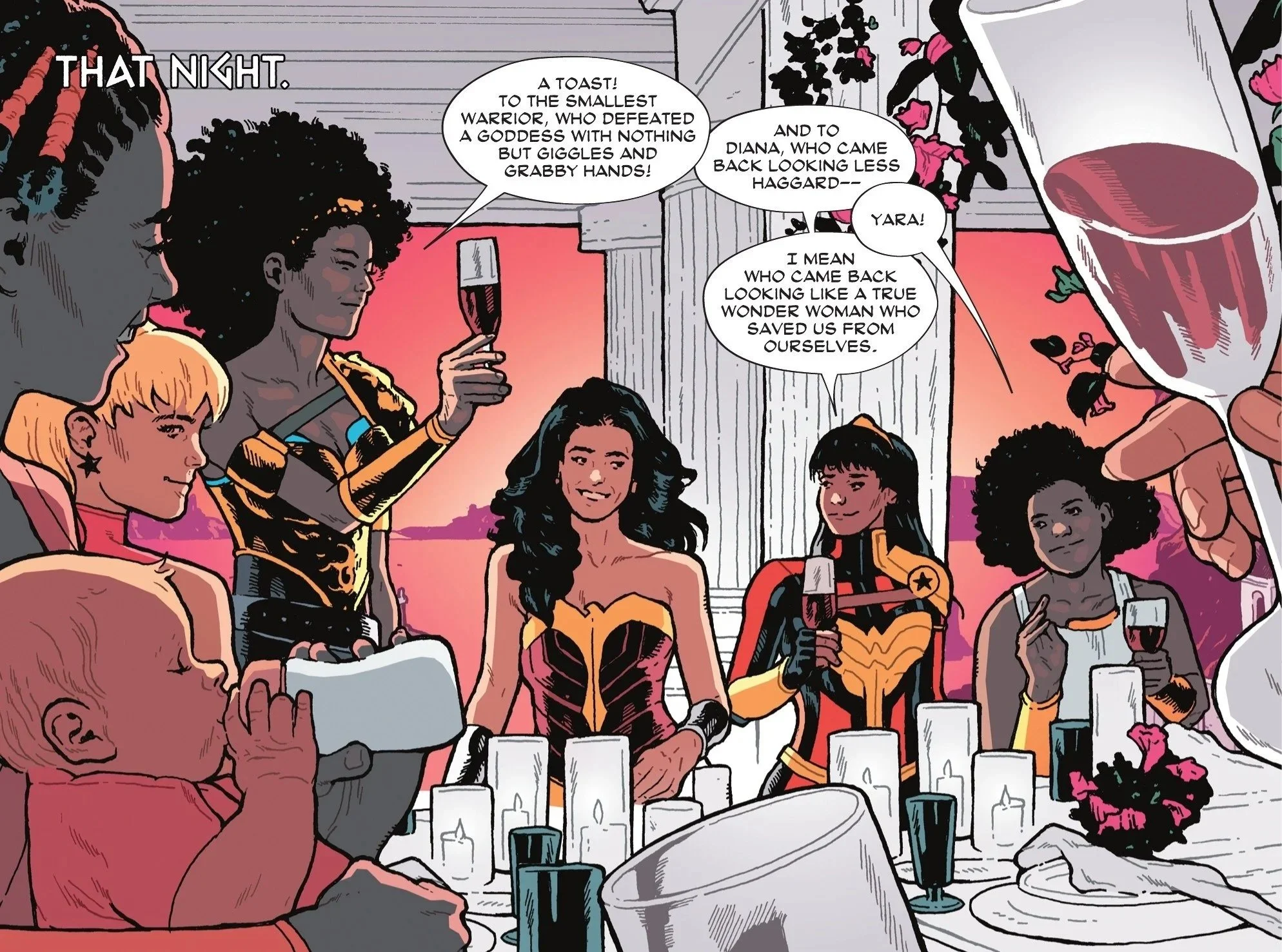 We jump ahead to later that night as the Amazons enjoy a toast dedicated to Lizzie herself for defeating a goddess. Lizzie babbles and eventually lets out a burp. This is as good a sign as any that she will fit right in with a group of the strongest warrior women in the entirety of the DC Universe.