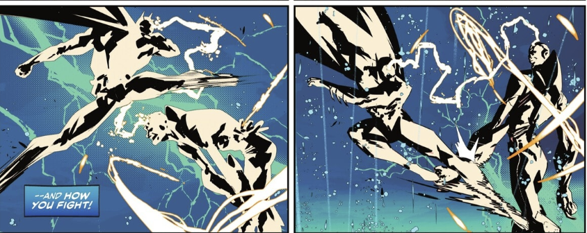 There’s a particularly brilliant scene during the fight where the two beings are silhouetted as they brawl in the middle of a rainstorm; that four-panel sequence is one of the coolest in the entire book. The Kryptonite blasts from The Merger are brilliantly rendered in a sickly lime green, and the lettering is a work of art in its own right, enhancing every major move. This was my personal favorite part of the book—just two super-powered beings going at it with everything they have across a cityscape in the middle of a storm. It’s peak comic book action: fists flying, powers exploding, and kinetically pleasing art.