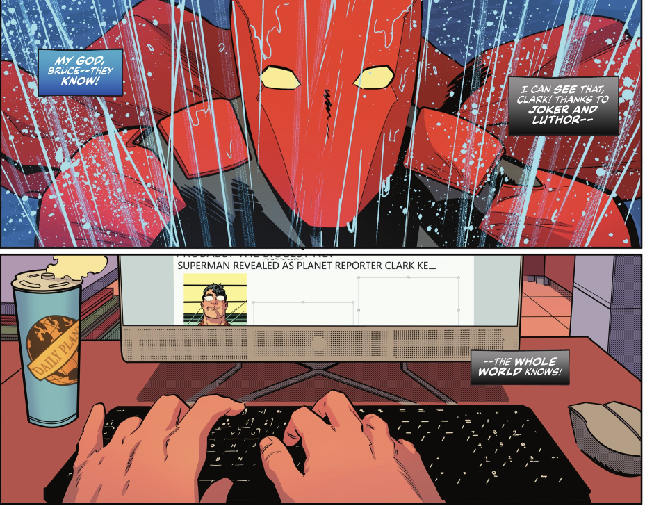 The emotional scene between Clark and Lois in Metropolis might just be my favorite part of the issue, and the art team did a great job making the scene of Mark Waid come to life. We can see the emotion on the face of Lois come through during the entire scene as she goes from disappointment to sadness to forgiveness. Even though we do not get to see the face of Fusion, his eyes and body language do more than enough to convey his somber tone. This is a deep moment between these two characters.