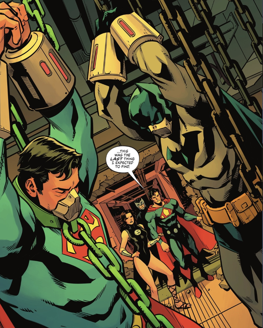 In a final act of desperation, Dr. Magnus makes a run for it and tries to find someone to save him and protect the item he has from S.T.A.R. Labs. To no one’s surprise, he meets an untimely end at the hand of one of Owlman’s owl-rangs. Ultraman, Owlman, and Superwoman gather in front of the room where the item is being kept, and Ultraman rips the door off, revealing none other than the Superman and Batman we know and love chained up inside. How did they get there? Who put them there? How are they going to get home? Issue #49 is already shaping up to be really fun.