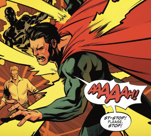 Before we continue on, there is one other tiny bit of a scene I want to put the spotlight on from this first act of the issue. When Owlman and Ultraman land on the roof across the street from the headquarters of Dr. Caulder and the Doom Syndicate, the next Talon up is already waiting for the duo. He sounds extremely nervous to be there, because he knows just how expendable he is and that once he goes down, and he will go down, the next poor soul is ready to take his place. He tries to offer a simple “Hi, my name is…” to Ultraman, who quickly shuts him down and says, “I really don’t care.”