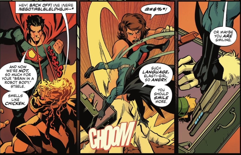 After completely demolishing the Doom Syndicate, Dr. Niles Caulder, who has been left in quite a horrible situation, tells the duo of Ultraman and Owlman that Dr. Will Magnus is in possession of the mysterious S.T.A.R. Labs item. With that information, a trip to visit the Metal Men is on the agenda. Subtlety is not Ultraman and Owlman’s cup of tea, so they bust through the wall of Magnus Robotics while Dr. Magnus is working on one of the Metal Men, Tina. It is not so subtly implied that she is his lover, and no sooner does she try to defend her man than does Ultraman rip through her chest and crush her mechanical heart.