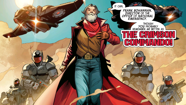 Crimson Commando talks to the media saying that in order to protect the United States, as a veteran he is announcing a partnership between O*N*E and the X-Men. To use the mutants abilities to keep the world safe from terrorism. Cyclops slaps him away and asks him what he's doing. Commando reminds Cyclops that not too long ago he threatened the US Government, and he will make sure he NEVER does that again.