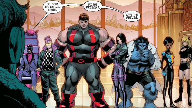 Cyclops meets with the team a week ago and he's seemingly back to normal? He says they have the same goal though, fix the presentation and save the future.