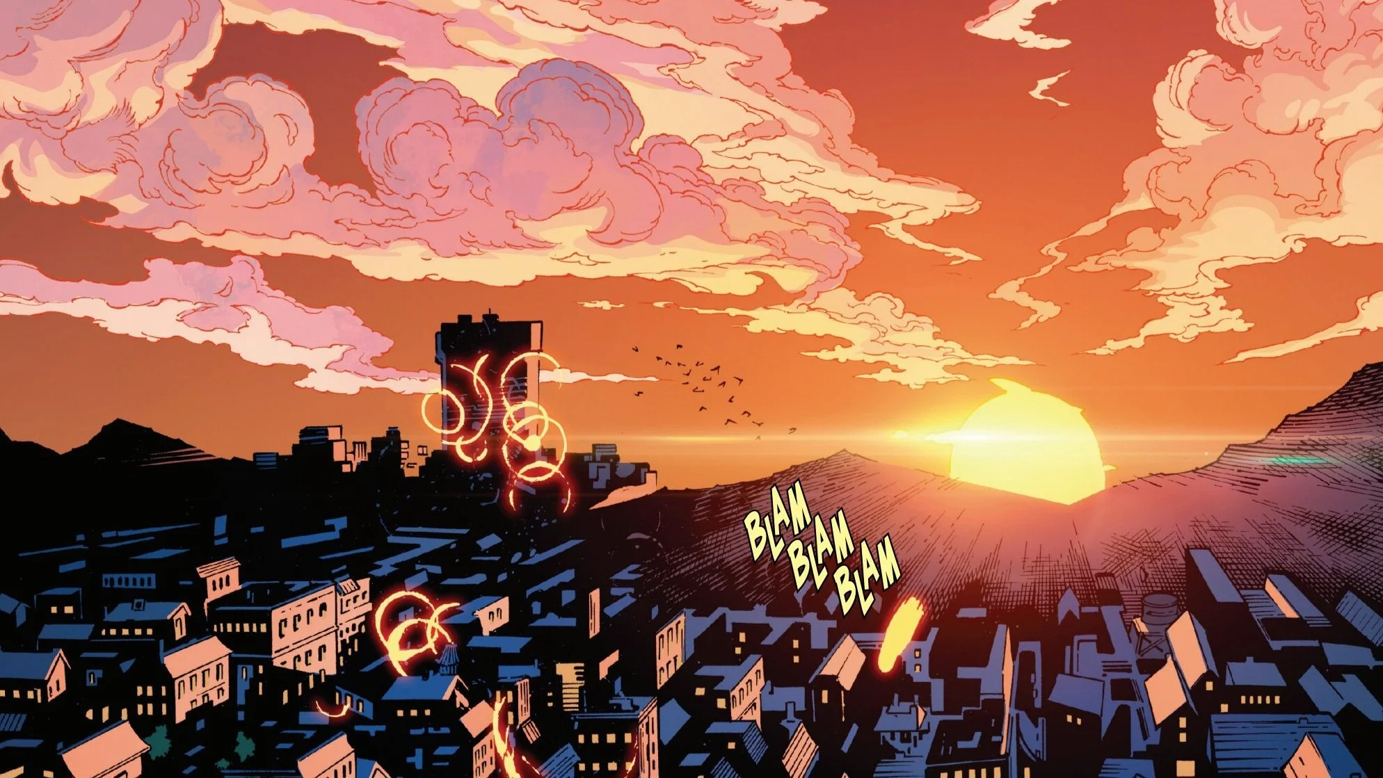 At the innocent vegetable stand, Glob is questioned about whether he’s a mutant. He answers jokingly—until he realizes the barrel of a gun is pointed at him. The gunman delivers a chilling line: “That’s all I needed to hear,” before three shots ring out, echoing through the suburban Alaskan town. The scene is framed against a beautiful yet haunting sunset, heightening the tension.