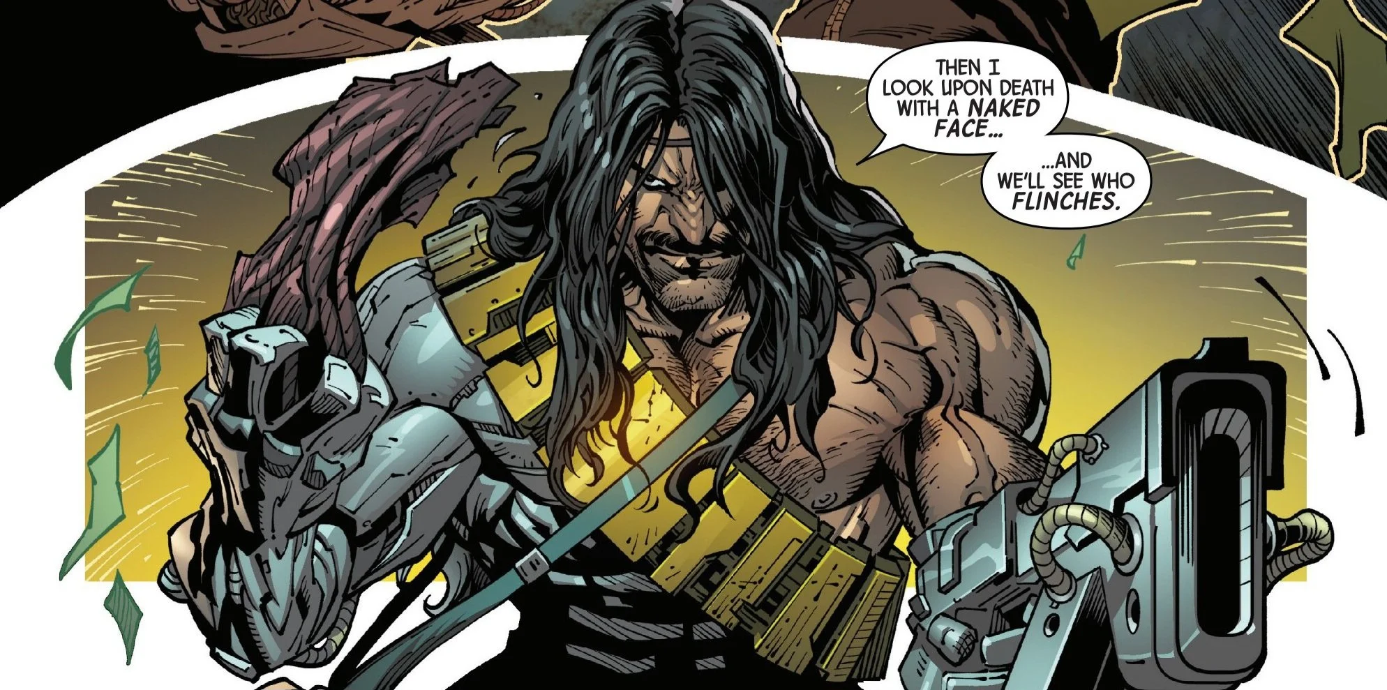 Issue #26 kicks off with an action-packed opening: a bank robber is fleeing the scene, calling out to his associate Amy, who isn’t responding. As he charges forward, the entire Milwaukee police force is waiting for him. The large man rips off his mask to reveal his face—John Greycrow, former love interest of Psylocke back on Krakoa.