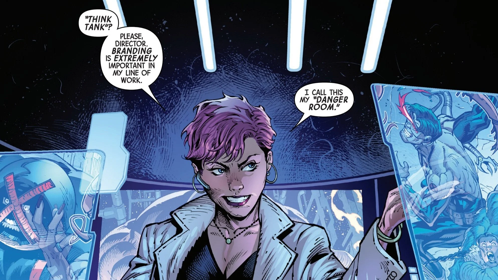 Meanwhile, in Washington, D.C., Crimson Commando sits at his desk, smiling with a defiant expression as he drinks his coffee and speaks on the phone with a woman named Maxine Danger. Maxine is orchestrating everything happening to the X-Men in the warehouse, declaring that they are now trapped in her “Danger Room.”