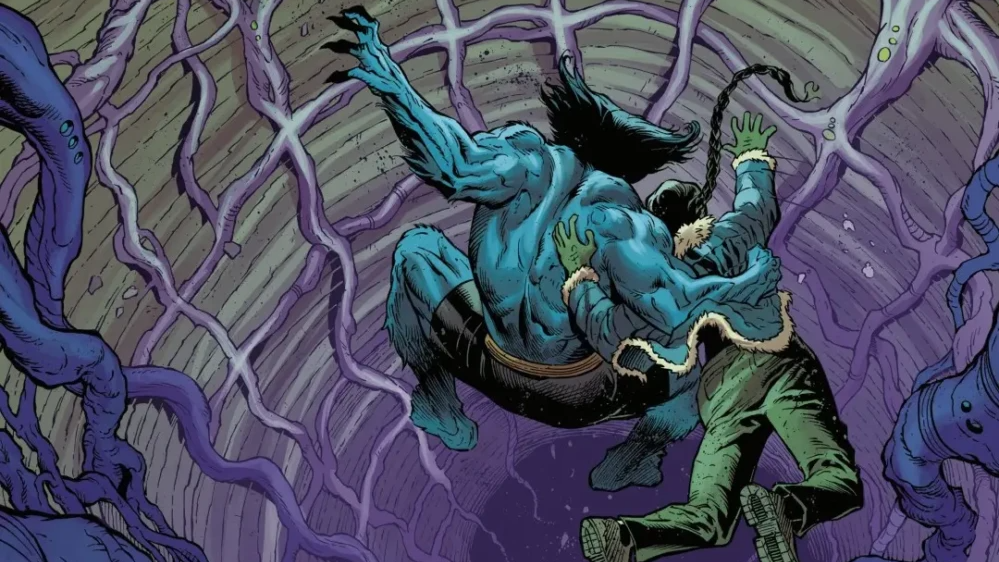 Beast clutches Sheriff Robbins safely under his arm, scanning the chaotic surroundings for a way forward. Realizing that the only path through this deadly maze is to take a risk, he leaps down into a dark pit, plunging deeper into the unknown.
