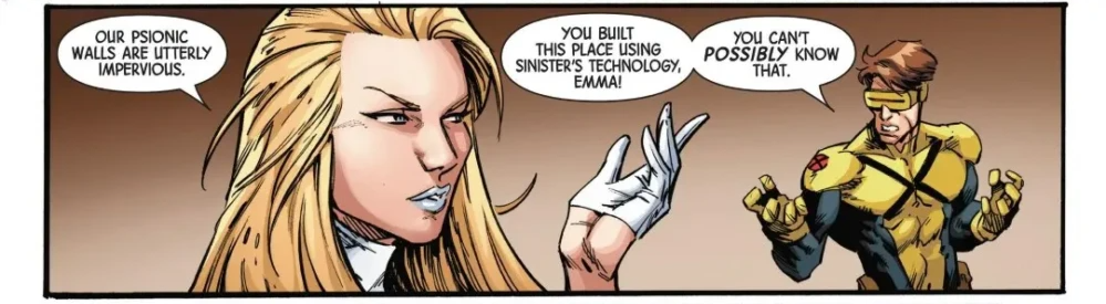 They try to calm Cyclops' nerves by saying that with the powers of Emma and Axo, they have been able to block any sort of attacks from the outside to harm them. Trying to hammer in the fact that they're truly safe. But Cyclops leaves in anger before being stopped by Kitty in the hallway. Cyclops is passionate about this being a dangerous idea and decides to completely leave this idea to everyone else but himself.