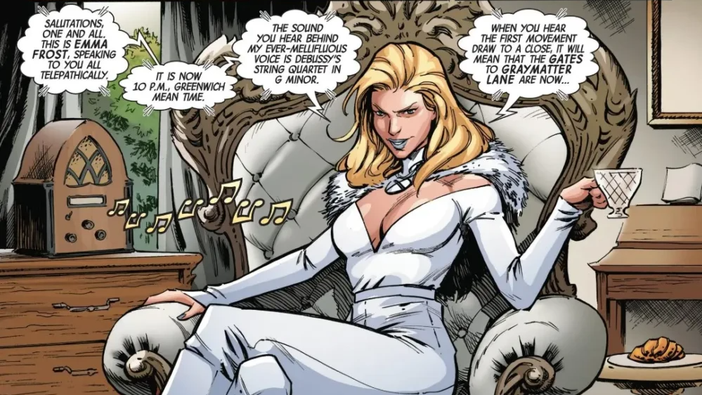 With her empowering aura, Emma Frost pours herself some tea and puts on some music. Announcing that the gates to Graymatter Lane are now open. All of the X-Men from across the world, no matter what team or location they're at. They follow these entryways being created for them to enter Graymatter Lane.