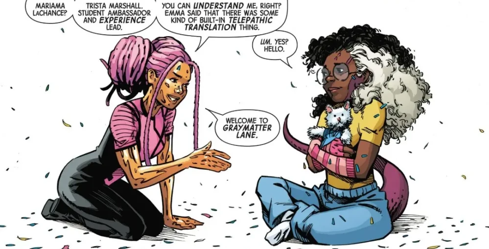 After Melee witnesses Mariama being bullied, she's slipped a paper with instructions on how to get to the X-Men that she follows and is brought to Bronze. Bronze welcomes her with confetti and a calm, welcoming demeanor.